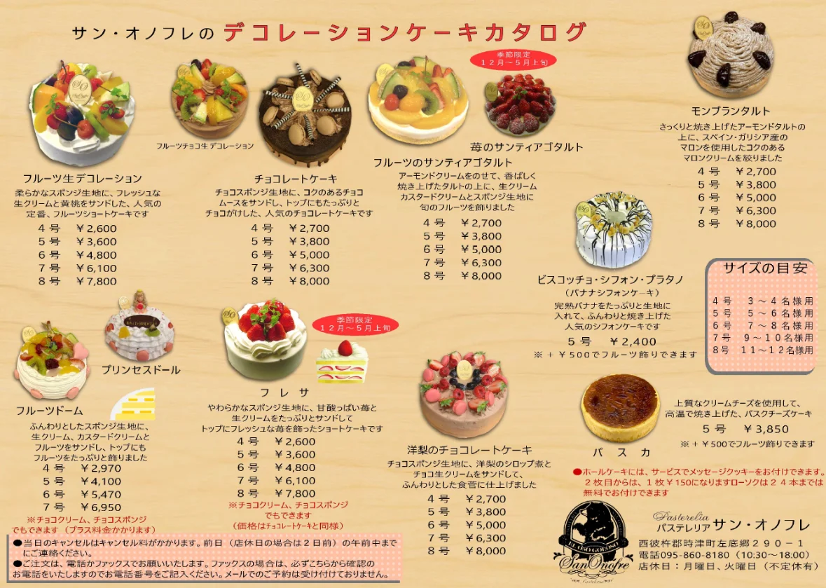 生菓子の種類は季節ごとに変わり、その季節だけ楽しめる特別なおやつを用意しています。イラストケーキや特注ケーキを注文する場合は、最低でも3営業日前にご予約いただくようお願いしています。ご相談や予約をご希望の際には、お早めにお問い合わせください。